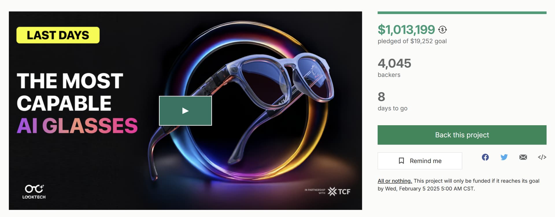 Well, meeting the goal surely didn't stop backers to pledge $1M for these "AI glasses" that had a $20K goal! We also have AI/ML which could be used for Asian stocks. Where's the excitement? Perhaps we're just lousy at marketing.