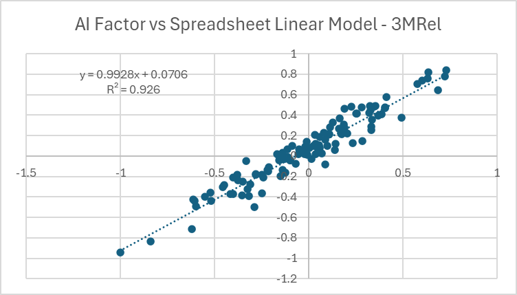 I can't think of any reason I shouldn't get exactly the same results, but I do not. Here is a scatterplot of the AI Factor Predictions vs my Spreadsheet Linear Model Predictions for a given date.