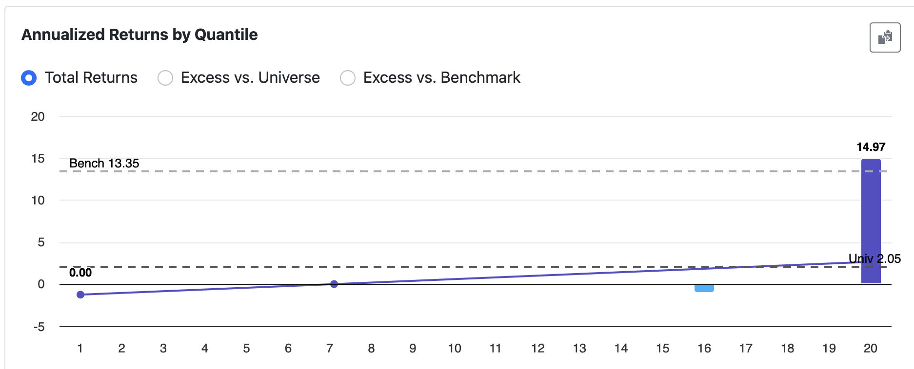 I have quite a few factors which seem quite noisy (see Formula 1: GMGn% below), and so I’m trying to rewrite the factor to select from the higher ranking buckets (see Formula 2 below, selecting from buckets 14-16).