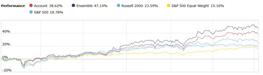 These are my results over the last year with Ensemble being the equity only portion of the account. I more than doubled the number of screens last summer with the weighting picking up and running with the precious metals run.