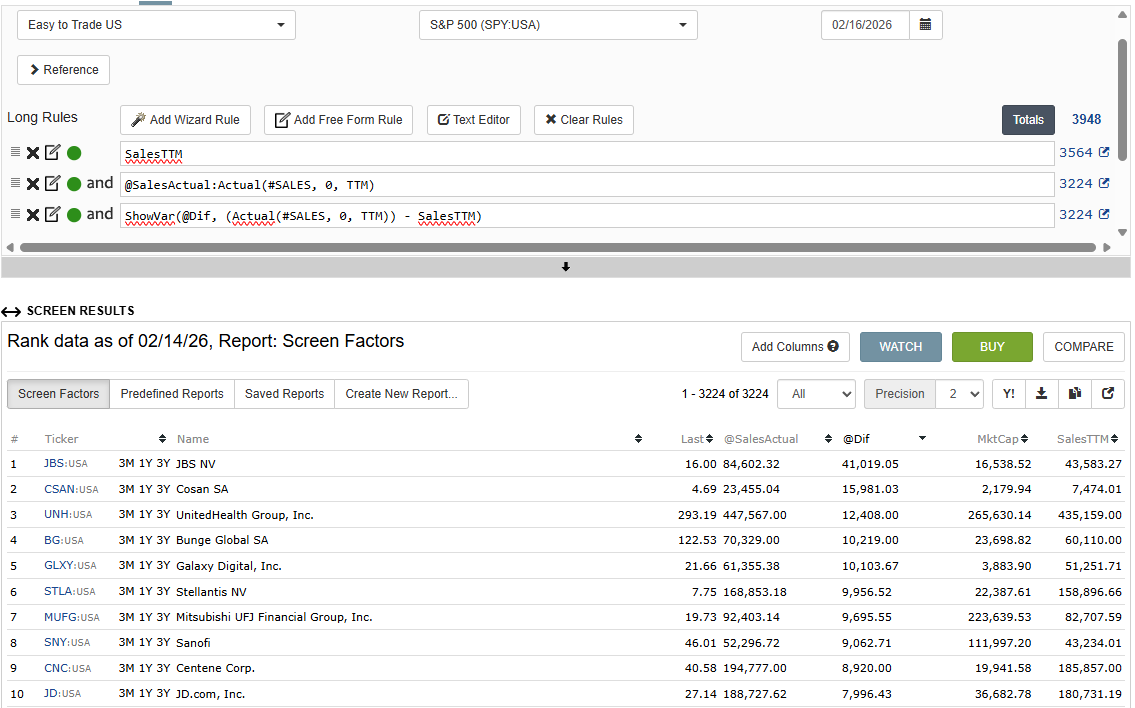 The outperformance AlgoMan puts a finger on happened between October 2020 and February 2023. Before and after those dates, the performance was congruent with that of the S&P 500. If you substitute for the rule frank("ActualGr%PQ(#EPS)",#all,#DESC,#ExclNA)>80 the rule frank("(EPSActual(0,Qtr)-EPSActual(1,QTR))/EPSActual(1,Qtr)",#all,#DESC,#ExclNA)>80 you get a very similar result. So I don't think, as JudgeTrade implied, that there's any lookahead bias here.