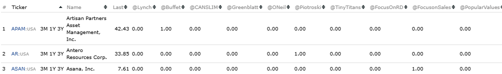 @Lynch:Screen("Lynch",10) or @Buffet:Screen("Buffett",10) or @CANSLIM:Screen("CANSLIM",10) or @Greenblatt:Screen("Greenblatt",10) or @ONeil:Screen("ONeil",10) or @Piotroski:Screen("Piotroski",10) or @TinyTitans:Screen("Tiny Titans",10) or @FocusOnRD:Screen("Focus on R&D",10) or @FocusonSales:Screen("Focus on Sales",10) or @PopularValues:Screen("Popular Values",10)