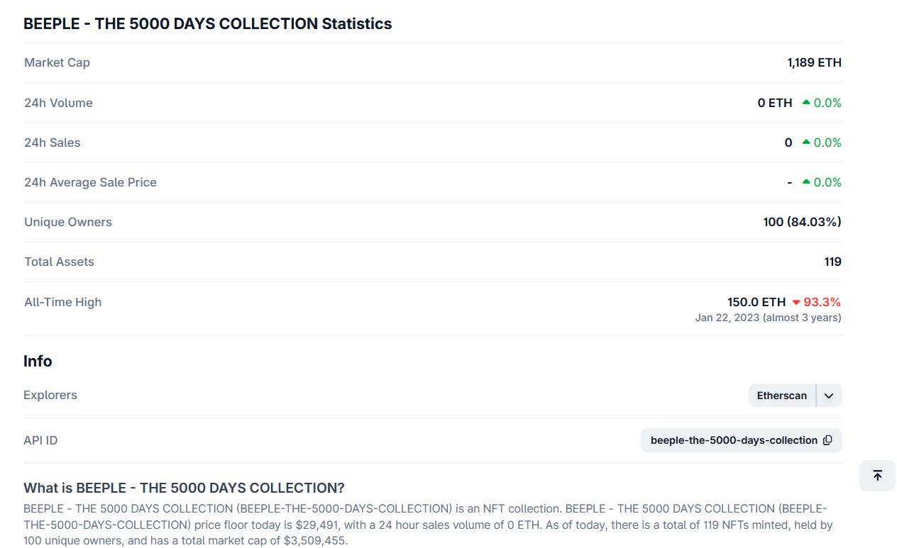You may want to checkout Beeple -The 5000 days Collection which is the 2nd highest NFT ever sold in history (pls see link below for the Top 10 highest NFTs sold). The price for one unique ownership currently cost less ETH 9.99 now.