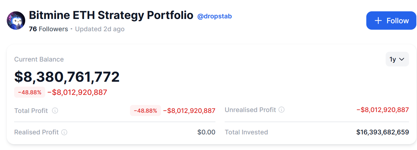Tom Lee ‘Bitmine’ floating loss on ETH is currently more than $8 billion.