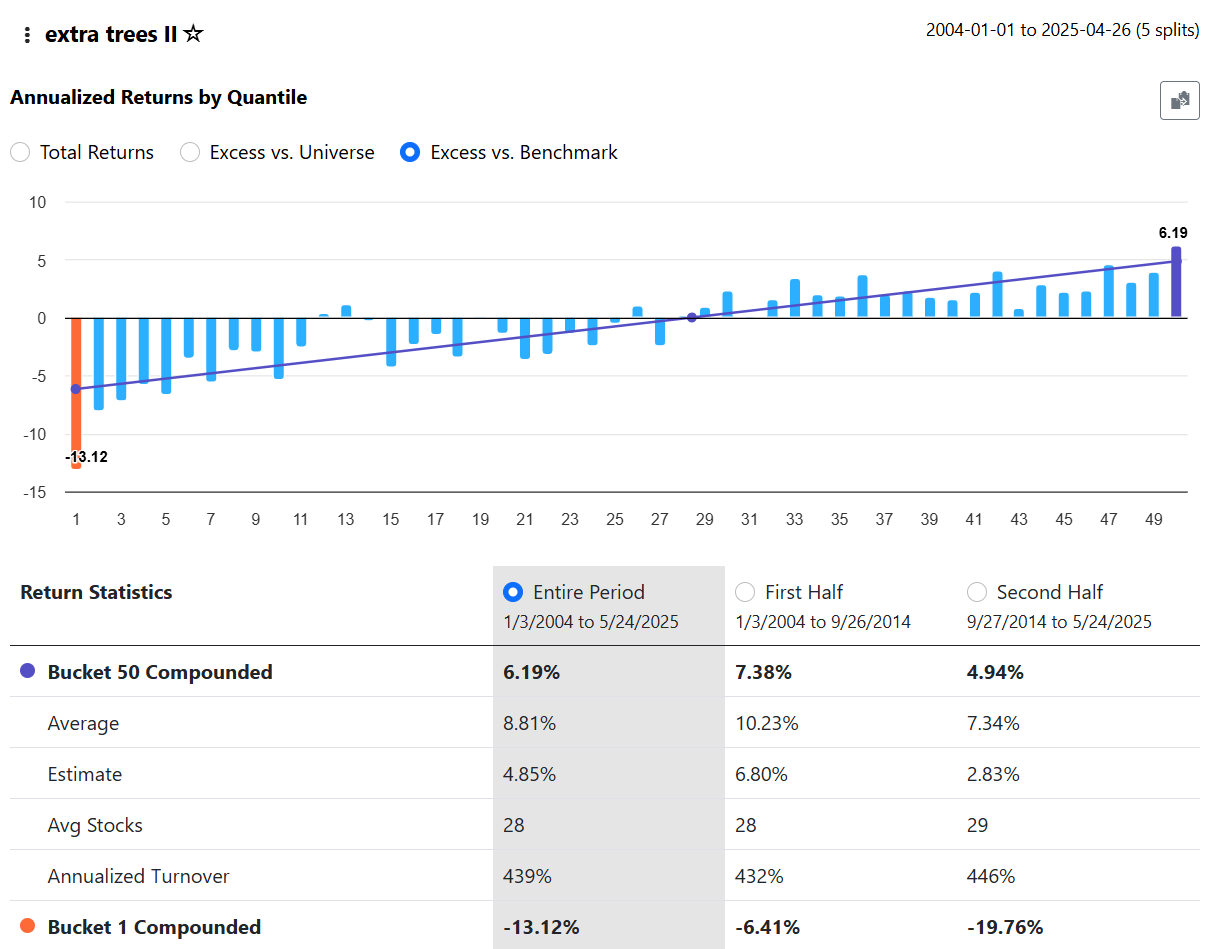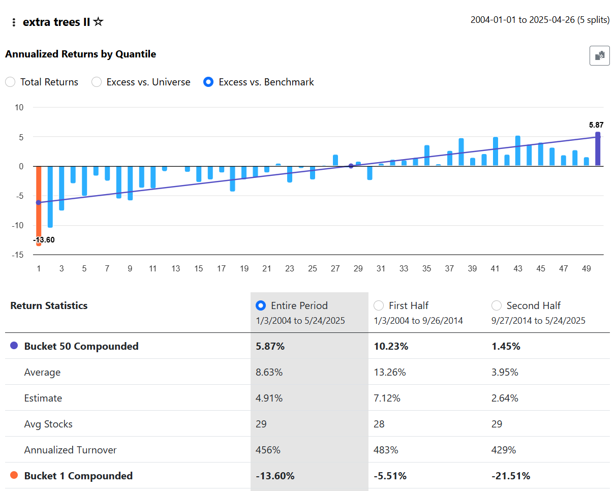 So with just those two parameters, you’re essentially replicating your multi-universe + randomized-feature setup in a scalable and automated way. The only meaningful difference is that ExtraTrees samples features at the split level, rather than fixing a set of features for the entire model as you do. But this design allows you to scale the process to thousands of randomized trees without sacrificing performance—and, as far as I can tell, without any real downside.