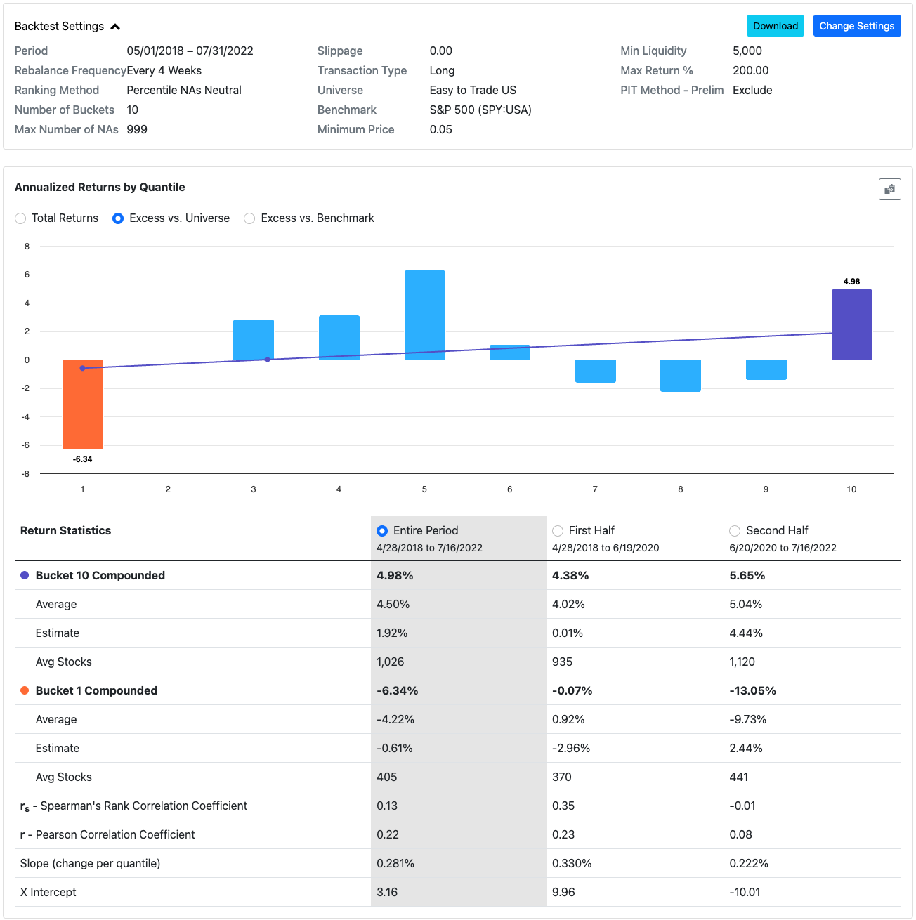 Rather than have N users create N copies of these borrow fees, I think this is a highly useful dataset that is worthy of being a sponsored project. Even if you are not shorting, there is potential utility for your ranking systems. Here are IBKR borrow fees as a factor (lower is better) for May 2018 through July 2022 on the Easy to Trade US universe: