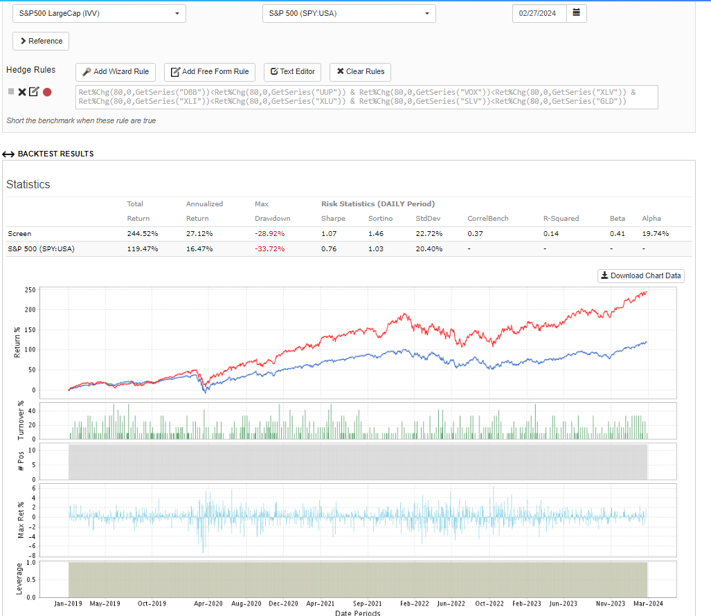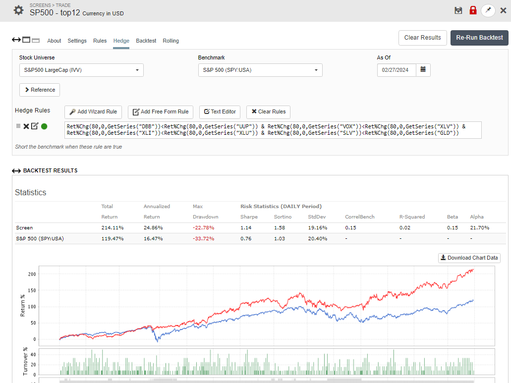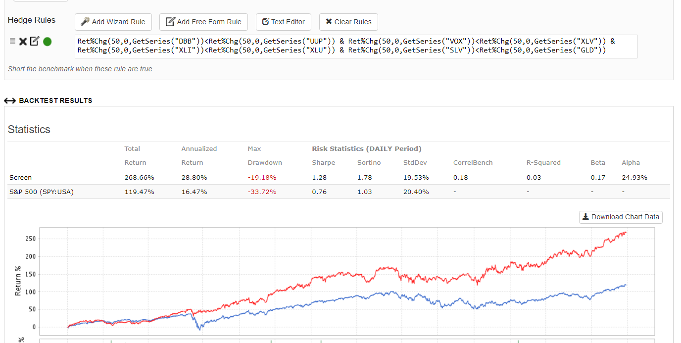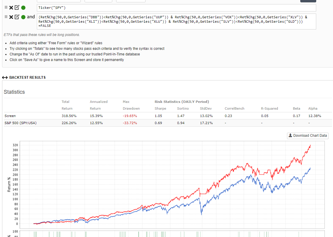 Seems to have quite a bit of whiplash. I tested it in a ETF screener that buys only “SPY”. Here’s the daily backtest
