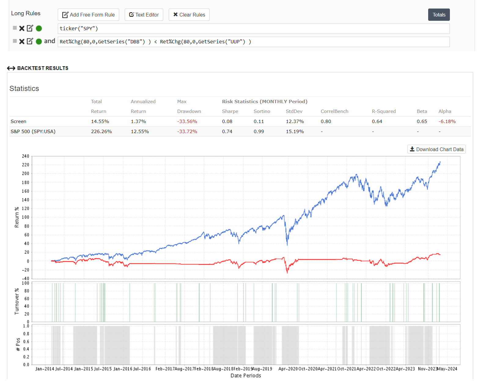 Ret%Chg(80,0,GetSeries(“DBB”) ) < Ret%Chg(80,0,GetSeries(“UUP”) )