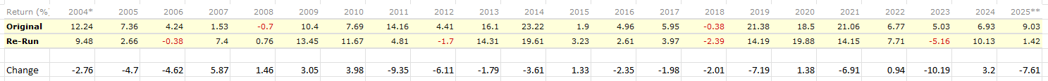 Interesting. I can see how this could explain the differences but I don’t understand how this could happen. In my mind, the past data is set in stone, so any calculations, entry/exit rules, etc, should produce identical histories every time a sim runs. Perhaps a small change to the data made by Factset could ripple through a sim, resulting in wildly different results? If so, then this would seem to raise some questions about robustness…..