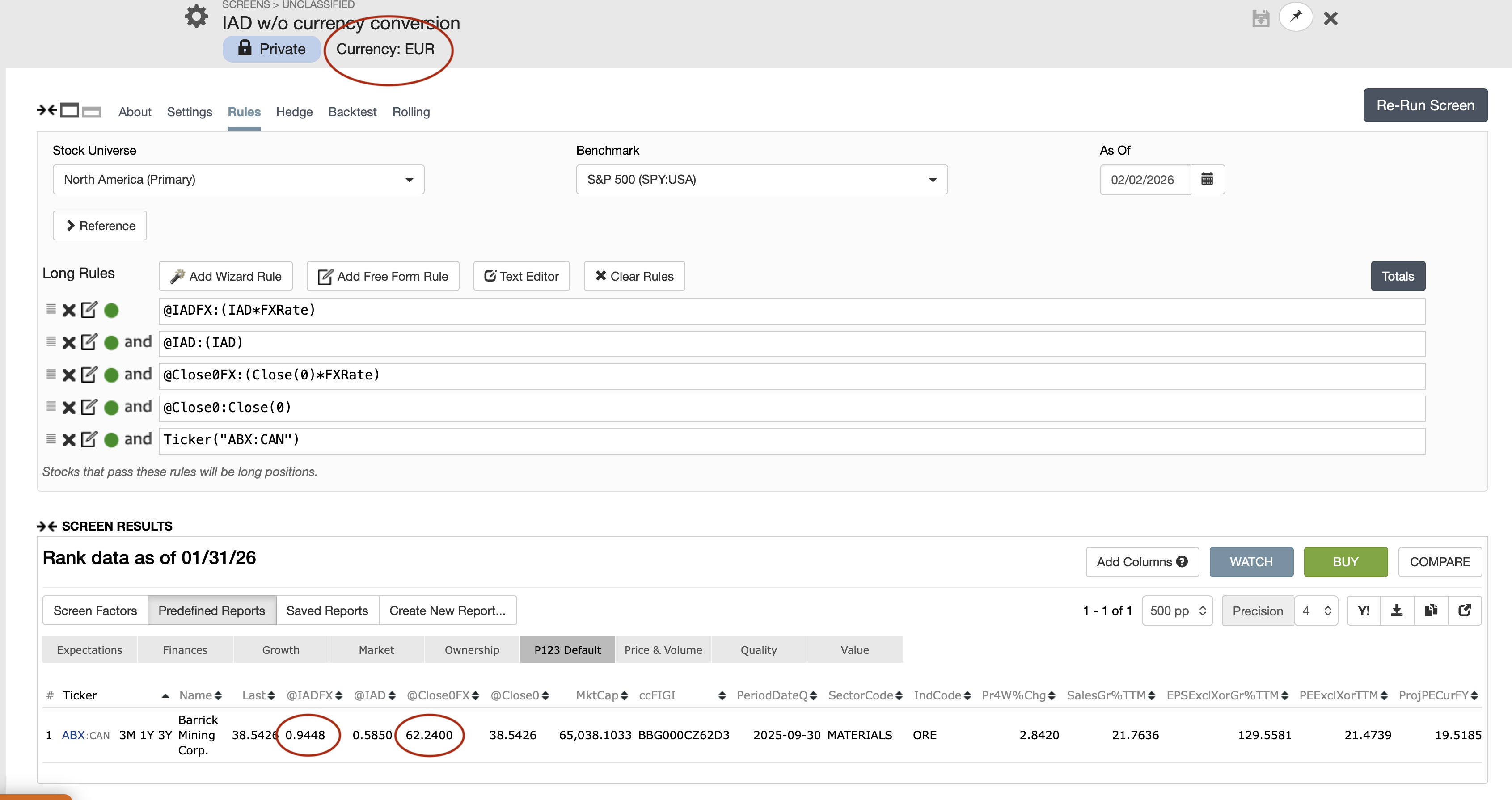 We're talking about different things here. FXRate works for screen/simulations currency settings. With the attached screen, @IADFX and @Close0FX always display CAD prices irrespective of the screener currency setting.