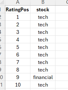 If we want to select top 10 stocks from each sector (tech and financials) based on two separate ranking systems, then this formula does not work for me: