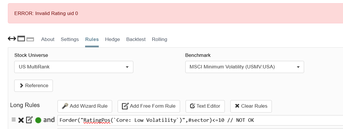 There's a limit to the number of different ranking systems you can use in one simulation (not sure what the limit is). But the language in the buy rules is easy: (Sector=Financial) * Rating("[name of ranking system]") + (Sector=Tech) * Rating ("[name of ranking system]") etc and then specify a threshold (e.g. > 99.5). You can also use RatingPos if you prefer and then your threshold would be < 6 or whatever.