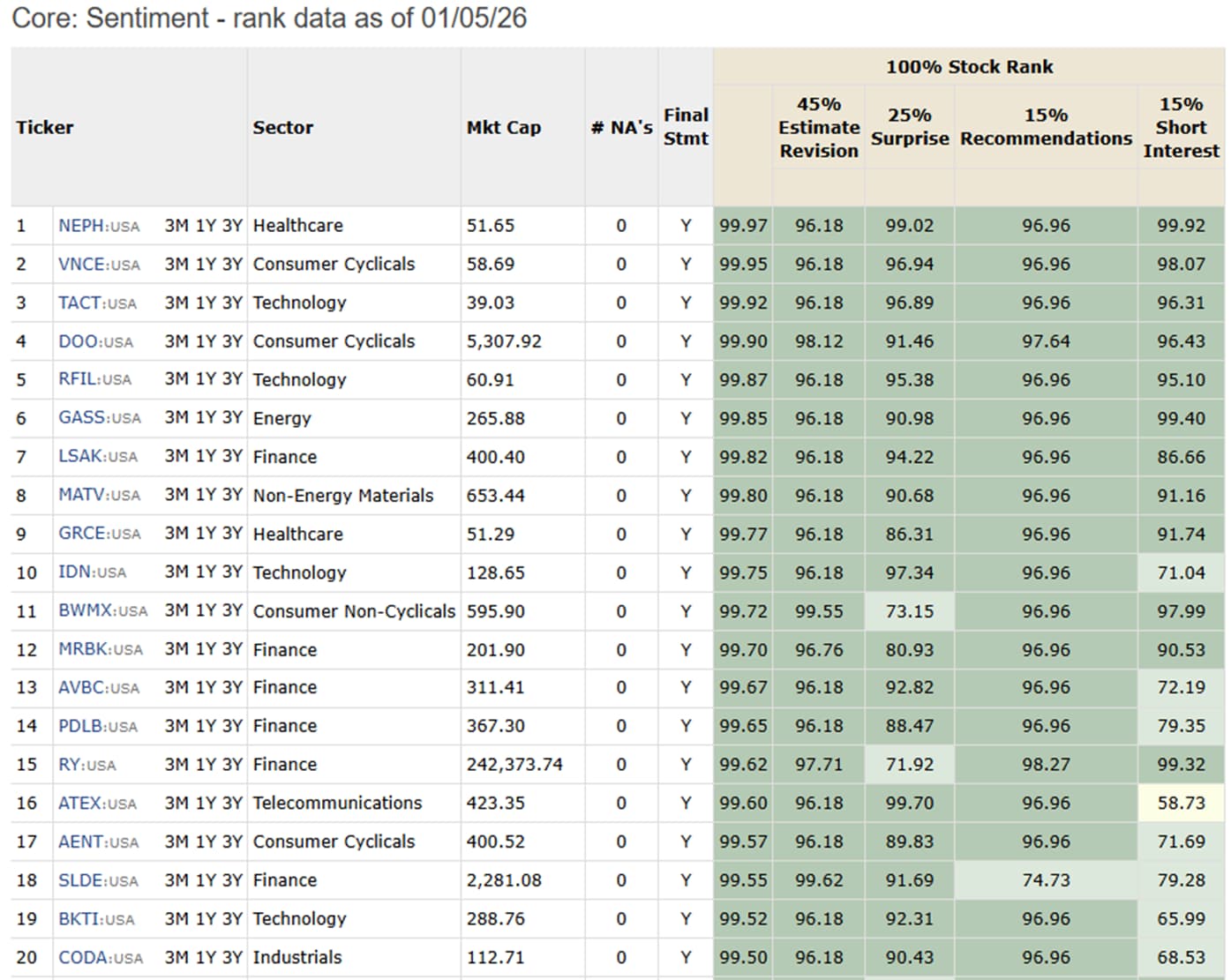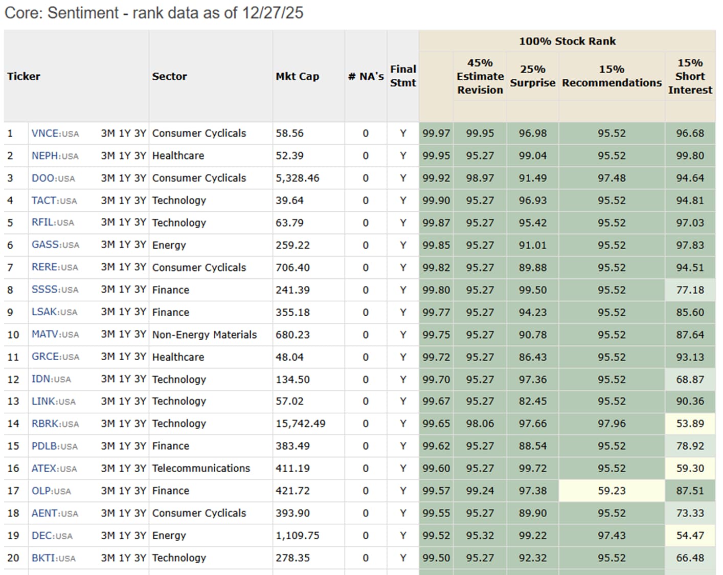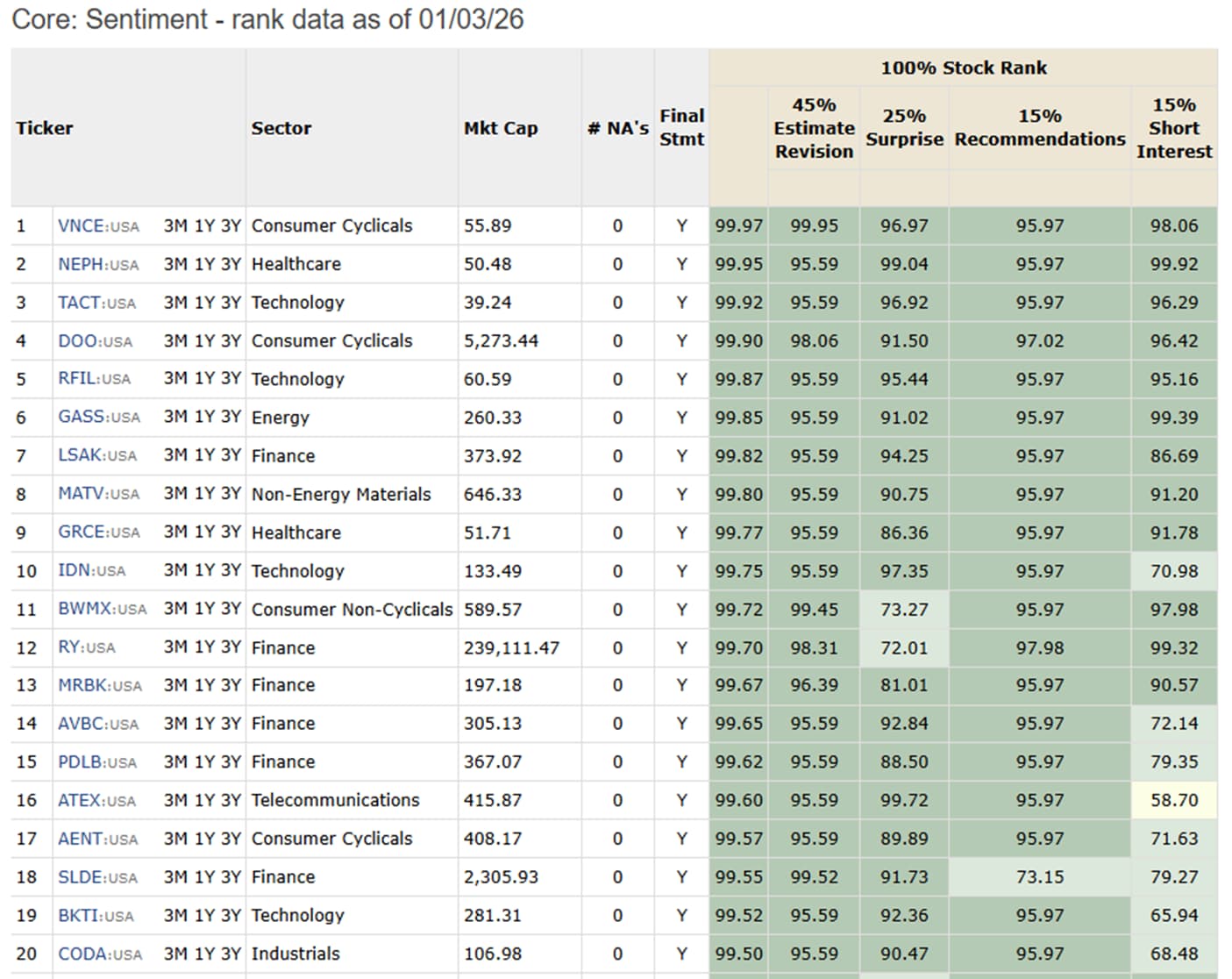 To test and verify this, I used the “Easy to Trade” Universe and the Core:Sentiment Ranking. First, looking at the ranking Systems when run on Friday Saturday and Sunday of this current week: