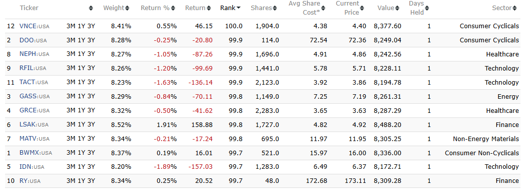 If this is by design, then I hope the above provides further clarity as to why Live and Simulated strategies differ. note: the smaller the number of stocks in a strategy (many of mine have just 5) the greater the potential impact is. One of my strategies last week and this week had two completely different stocks which has a significant impact on performance between live and simulated strategies. Simulated is always better - and yes, there has been lots of discussion around why - but I believe using different ranking data to order and place trades should not be one of them.