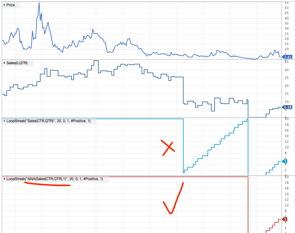 i tried this - LoopStreak("IsNA(Sales(CTR,QTR),1)", 20, 0, 1, #Positive, 1)