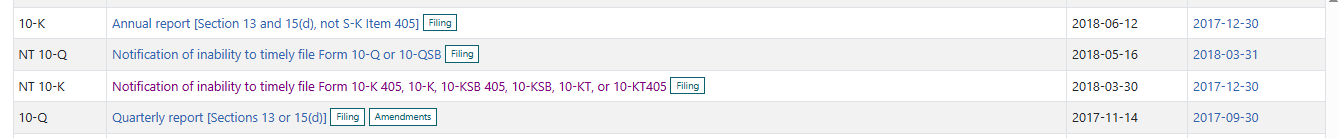 This is the interim data we have. Q4 for 2017-12-31 is missing because company did not file 10K on time. This will break the streak, and break continuity of the data which I think is a good thing. The 10-K was filed around June 12. This should have also filled in Q4 but it did not. So right now it looks like FactSet messed up a bit. Either way, nothing good going on with the company.