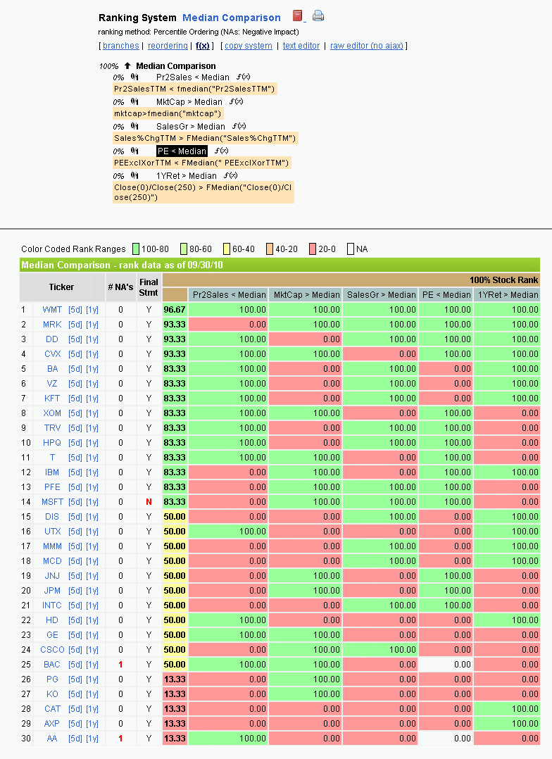 Please see the attached image. It used 5 binary functions that return either 100 or zero if the factor or formula for a particular stock is above the median. In essence each node acts like a binary switch giving either full score or 0 if the factor/function value is above the median. We think this has a lot of value as well instead of straight ranking of each node.