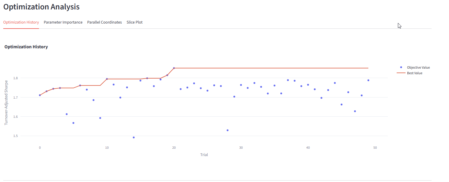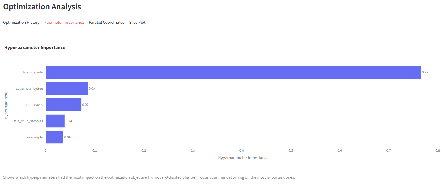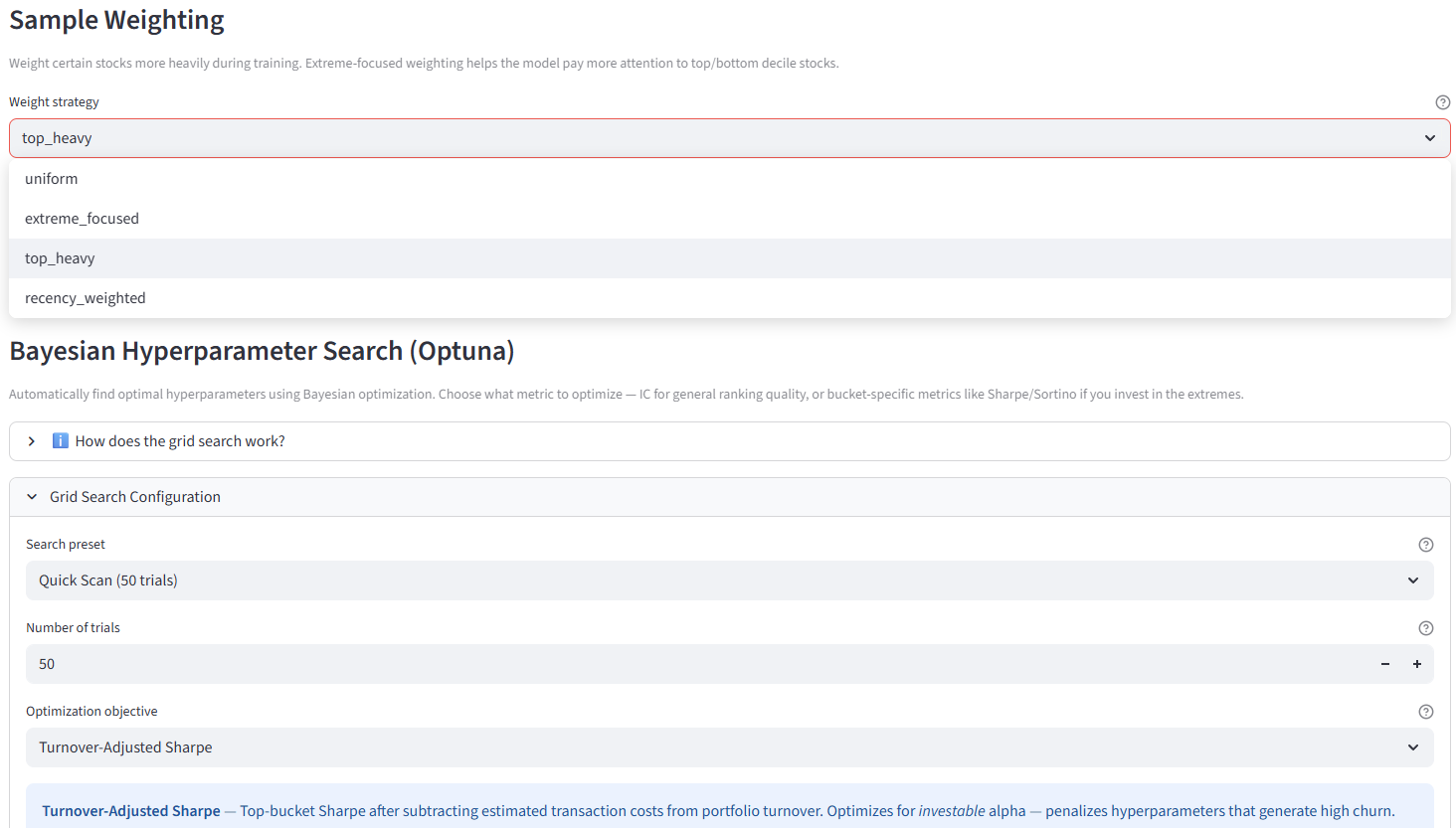 One very powerful feature is the ability to use different optimization objectives that push your hyperparameters toward different goals. For example, instead of just maximizing IC, you can focus on the tail ends using Conditional IC, or optimize for risk-adjusted returns with Top Bucket Sharpe. The learning objective (what the trees train on) stays the same — the trees are still just trying to predict returns. But the optimization objective tells Optuna which set of hyperparameters produced the most useful predictions, and that changes everything.