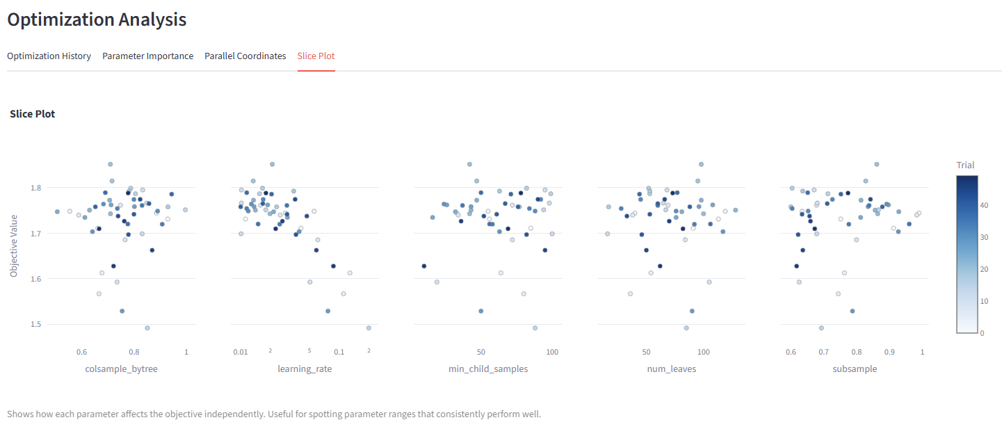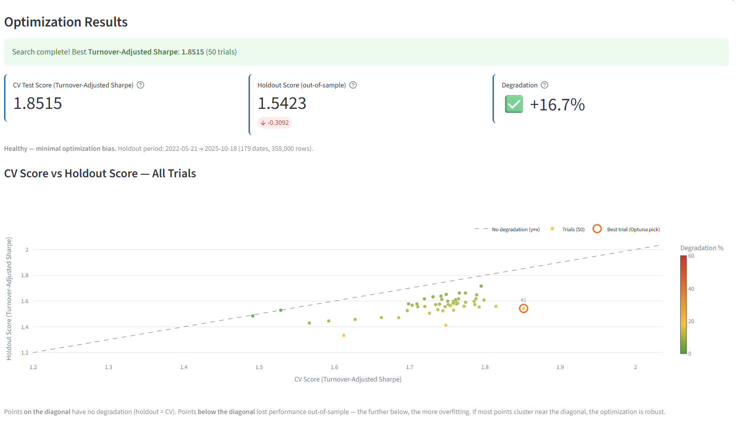 To guard against overfitting the search itself (meta-overfitting), I also added a chronological holdout test set that Optuna never sees. After the search completes, all trials are evaluated on this holdout data, so you can see whether the top-scoring CV trials actually held up or just got lucky. A scatter plot of CV Score vs Holdout Score makes it easy to spot — points on the diagonal are robust, points below it are overfitted.