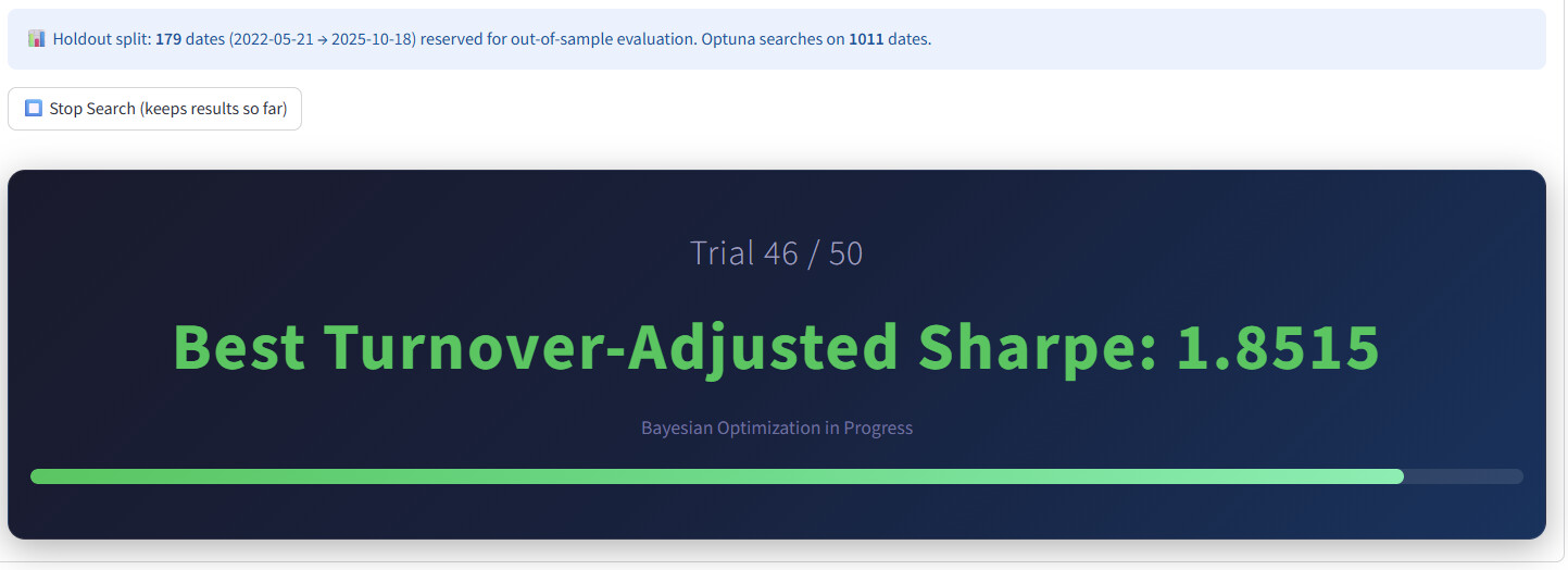 These objectives can be improved even further. There has been a lot of discussion about the issue of turnover cost when the model picks high-spread micro-cap stocks. With this grid search you can take turnover cost into account. I did a simple trial with a Turnover-Adjusted Sharpe — it adds a cost each time a stock enters or leaves the top bucket, which forces Optuna to steer the hyperparameter search toward parameters that produce more stable, cost-aware rankings. So the target never changes, the tree structure doesn't change for any given hyperparameter set — but the selection pressure on which hyperparameters win does.