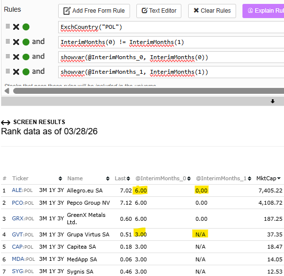 N.B. if your rules rely on quarterly changes, like Q over Q changes, it's best to create universes that eliminate companies with semiannuals with a rule such as LoopSum("IsNA(InterimMonths(CTR), 3) != 3", 2) = 0 since Q over Q for semiannual companies will still result in NAs since we inject empty 3 month gaps in semiannual periods.