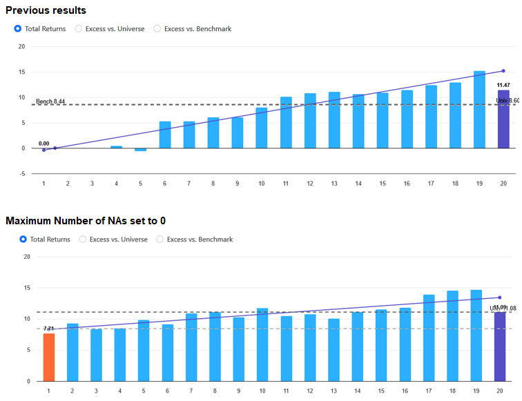 We released a change today that is especially useful when testing a single factor using the Rank Performance page. The 'Maximum Number of NAs' setting was added to the Rank Performance page and is also available in the API.