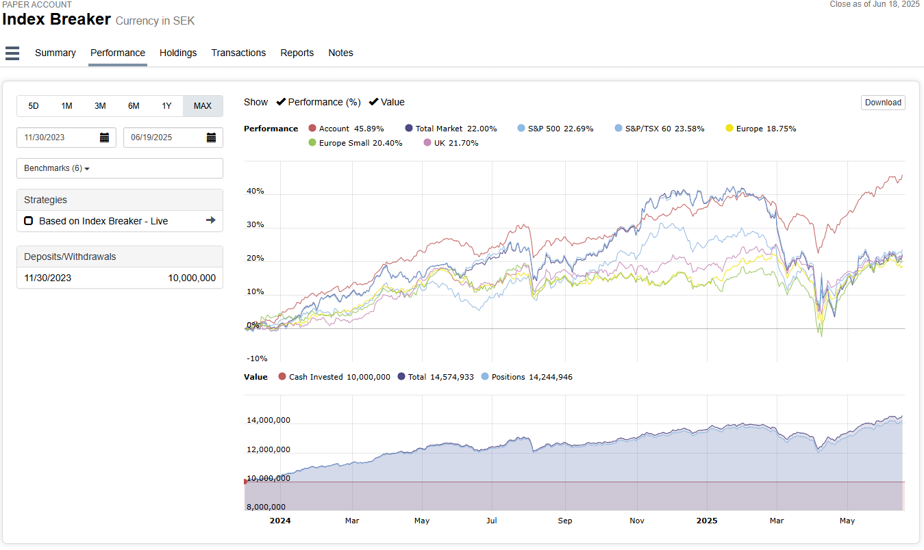 Just want to share results from a simple strategy I have keept alive on a paper live account. It's mainly based on the "Core Combination" Ranking system with a size factor and trades the "Easy to Trade North Atlantic" Universe and hold 500stocks. Last few month it has taken off, to me that indicates that we are in a period where factor investing is favourable.