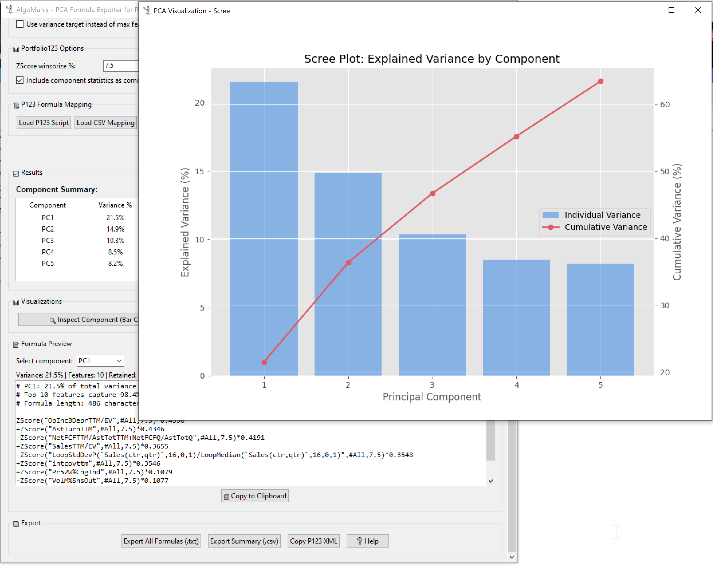 What it does: It takes your factor data (CSV export from Portfolio123), performs PCA, extracts the components, and automatically generates weighted formulas ready for Portfolio123. You can copy/paste them into a Linear Ranking System or use the "Copy P123 XML" feature to import a complete multi-component setup in seconds.