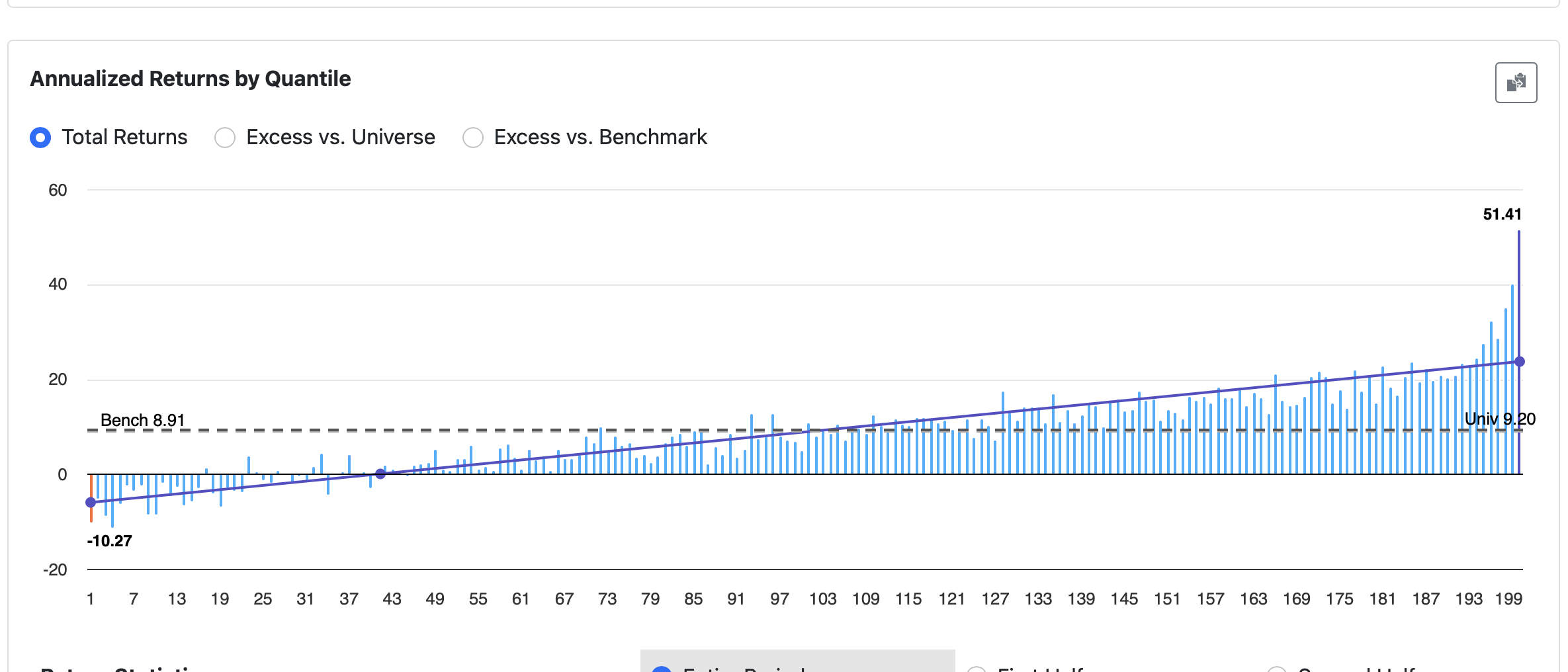 If this were truly a linear function, the top bucket would not stand out as such an extreme outlier. The fact that the highest-ranked bucket consistently shows a very large deviation indicates that the relationship is not linear, especially at the extremes. And most of the stocks we actually buy come from those extreme ranks.