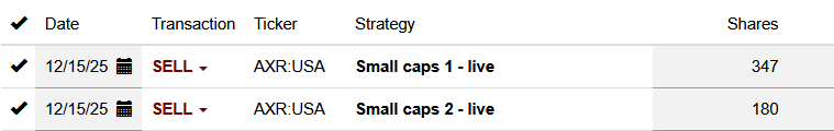 I have multiple live strategies I follow. On IB, I manually input orders for buying and selling stocks as I want to use order types not proposed on the Trade platform. The day after, I have to reconciliate within the Trade platform. However it partially forces to allocate to the wrong strategies. Please see below an example while everything should be on small caps 2.