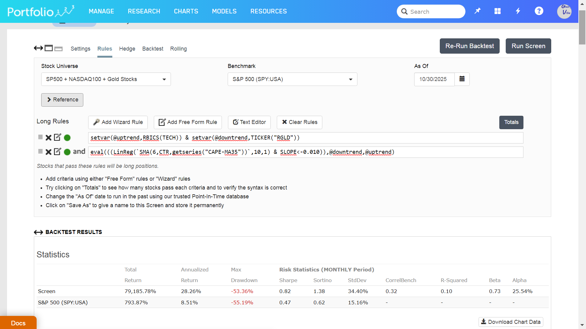 Works fine in the screener. No ranking. Returns annualized 28% with all the Tech stocks (about 80) of the universe during Uptrend, and switches to gold streamer RGLD for Downtrend periods, all as defined by the slope of the 6-mo moving average of my monthly CAPE-MA35 series.