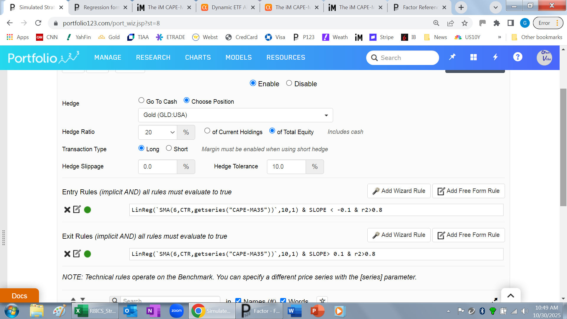 It is a monthly period series because the Shiller CAPE is monthly. I have no idea why the hedge module does not like the complete LinReg(), but it is happy when I give it the LinReg() via a formula.
