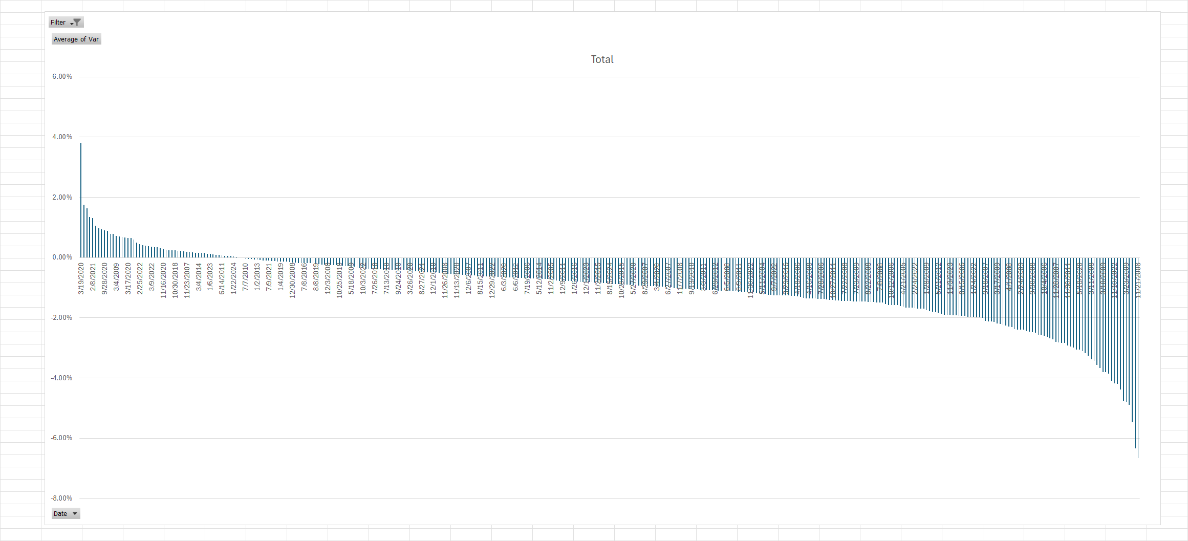Very much the opposite skew. This tells me that there is a lot of short covering in the R2K historically on large up days.