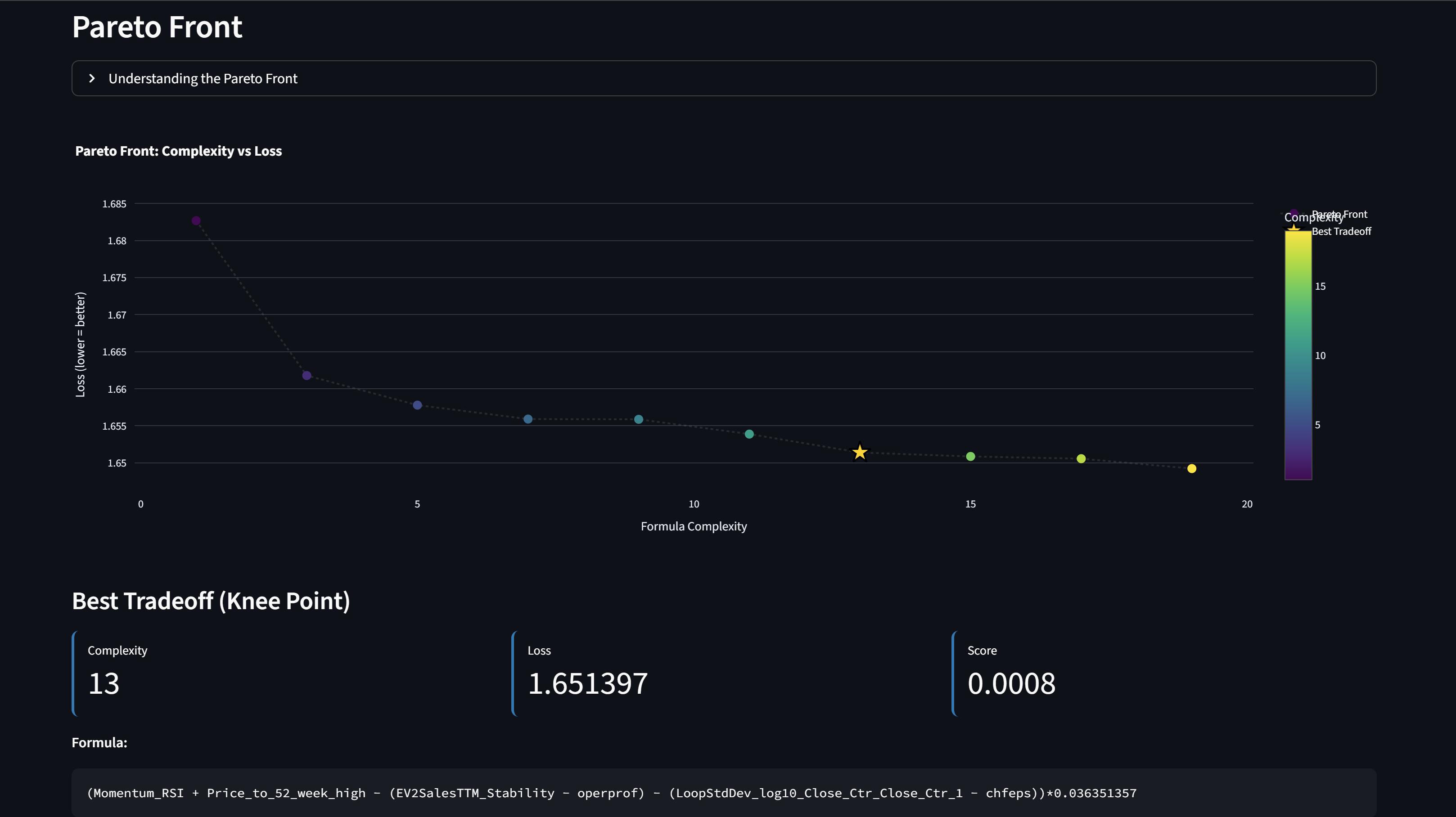 Think of it as an alternative to LightGBM/neural networks for factor discovery, except the output is a readable formula like: