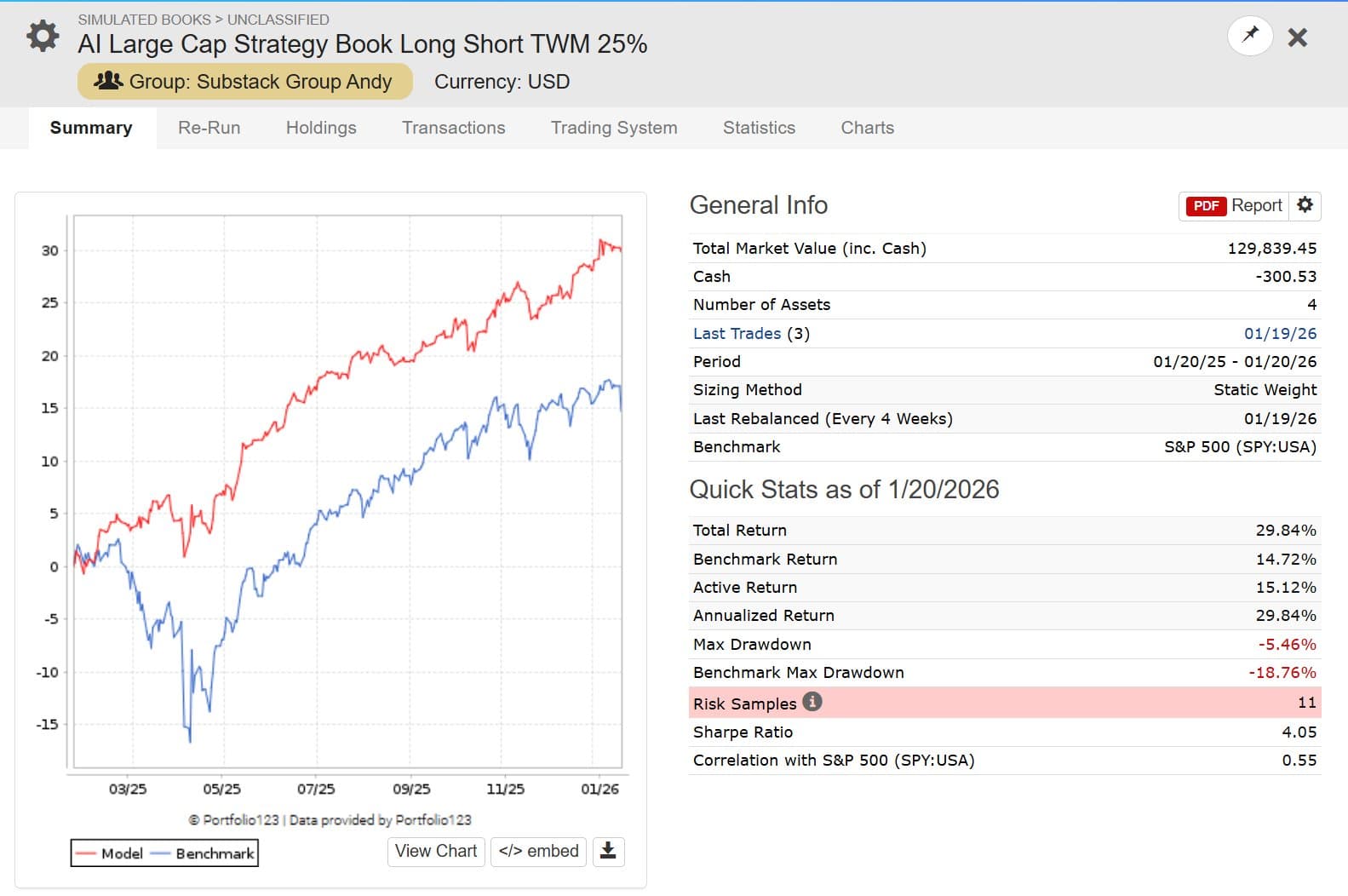 My Long/Short (Substack: Systematic AI Investing Portfolios, see my profile) book is holding up well: Long AI Factor S&P 500 models, hedged with a hefty 25% short on the Russell 2000 (TWM). This is working even as IWM shows strength right now.