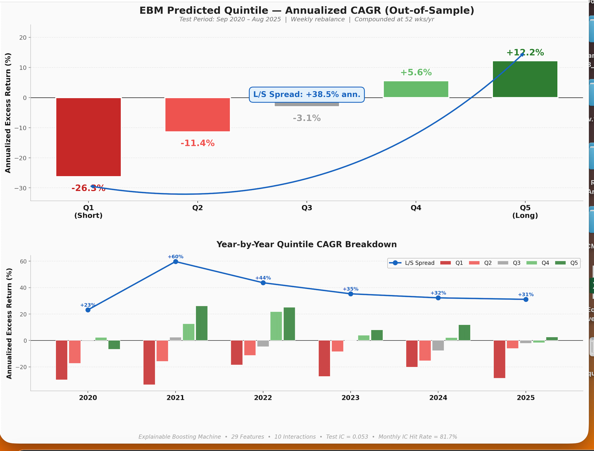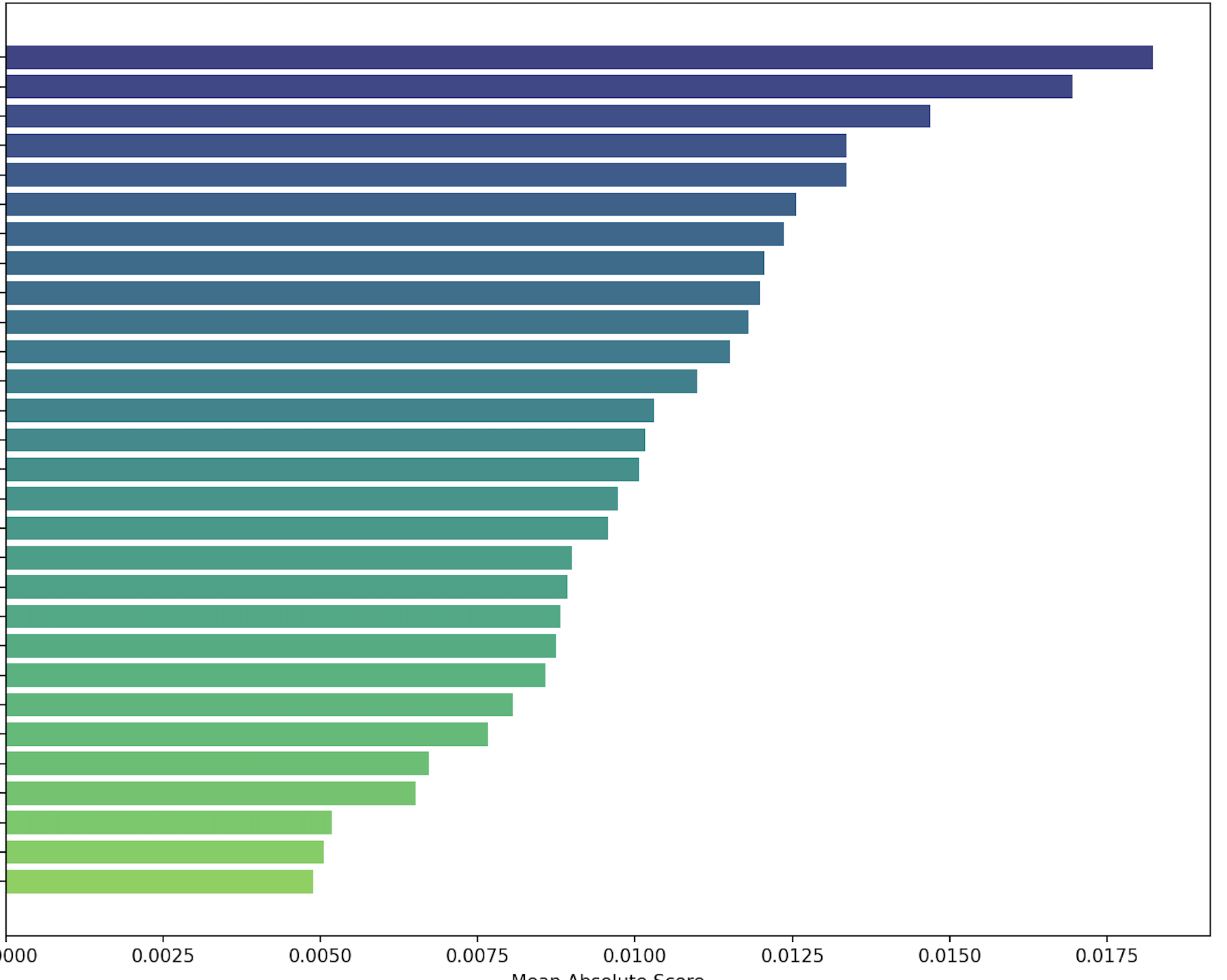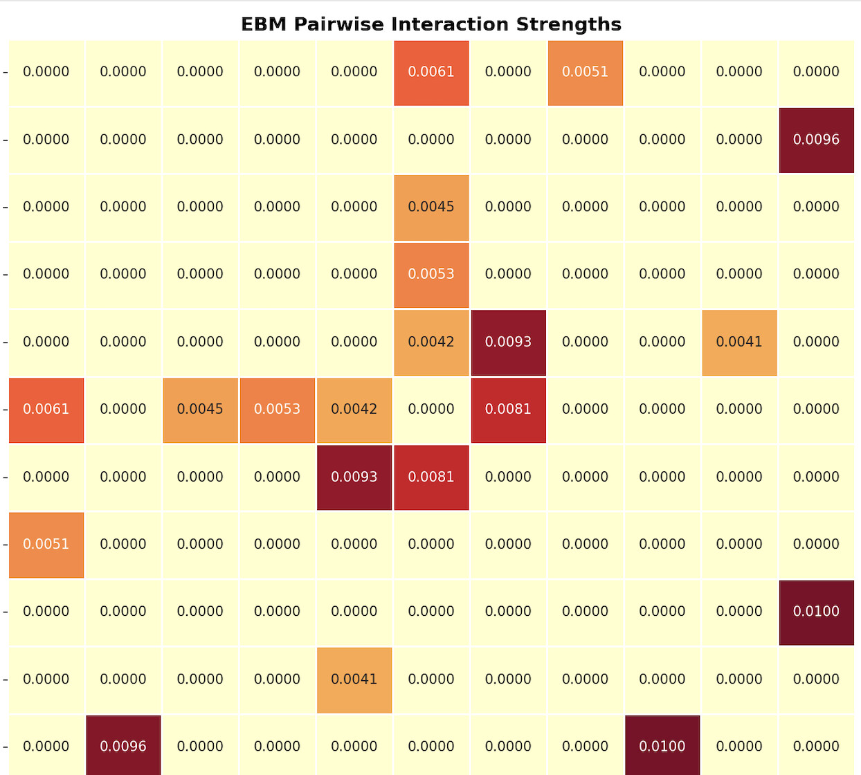 One interesting aspect of EBMs is that they can estimate pairwise interaction strength. In this case, forward EBITDA/EV shows a measurable interaction with EBITDAQ/EV (a core value metric already present in the ranking system). In the heat map, that interaction appears at the far right, second square down. Most other feature pairs show little interaction, which by itself is interesting. Here is the heat map with most features masked: