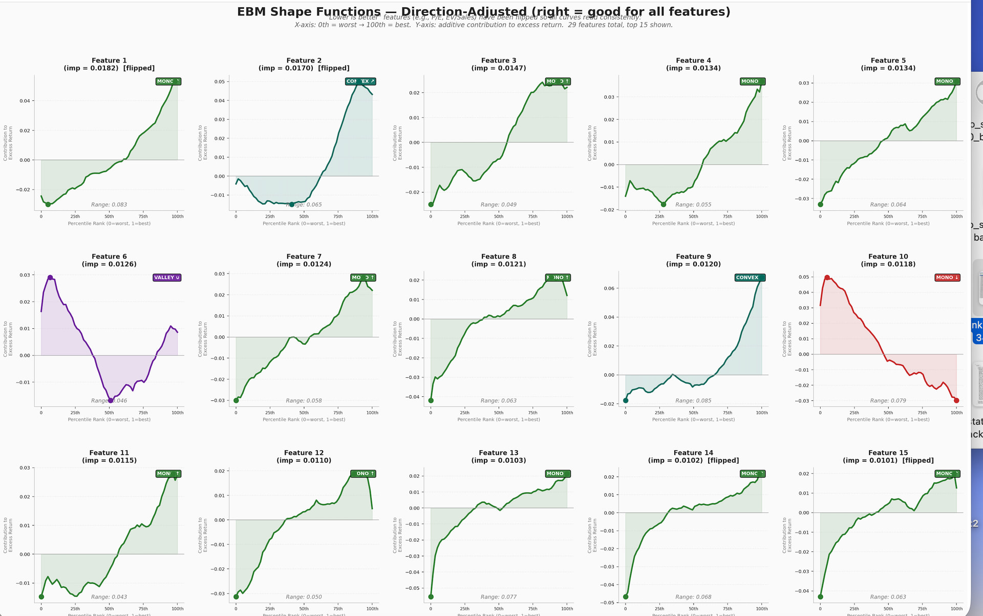 Also worth clarifying: you say the features are "all monotonically increasing in a P123 rank performance test as single features" — that's their univariate behavior. The EBM shapes are conditional on all other features being in the model simultaneously. A feature can look monotone alone but take a different shape once you control for correlated features. That's a key insight worth calling out