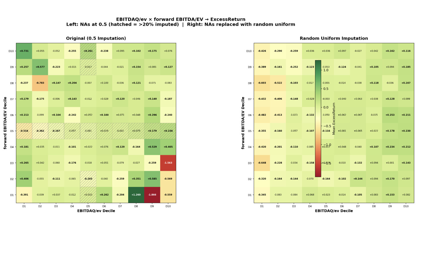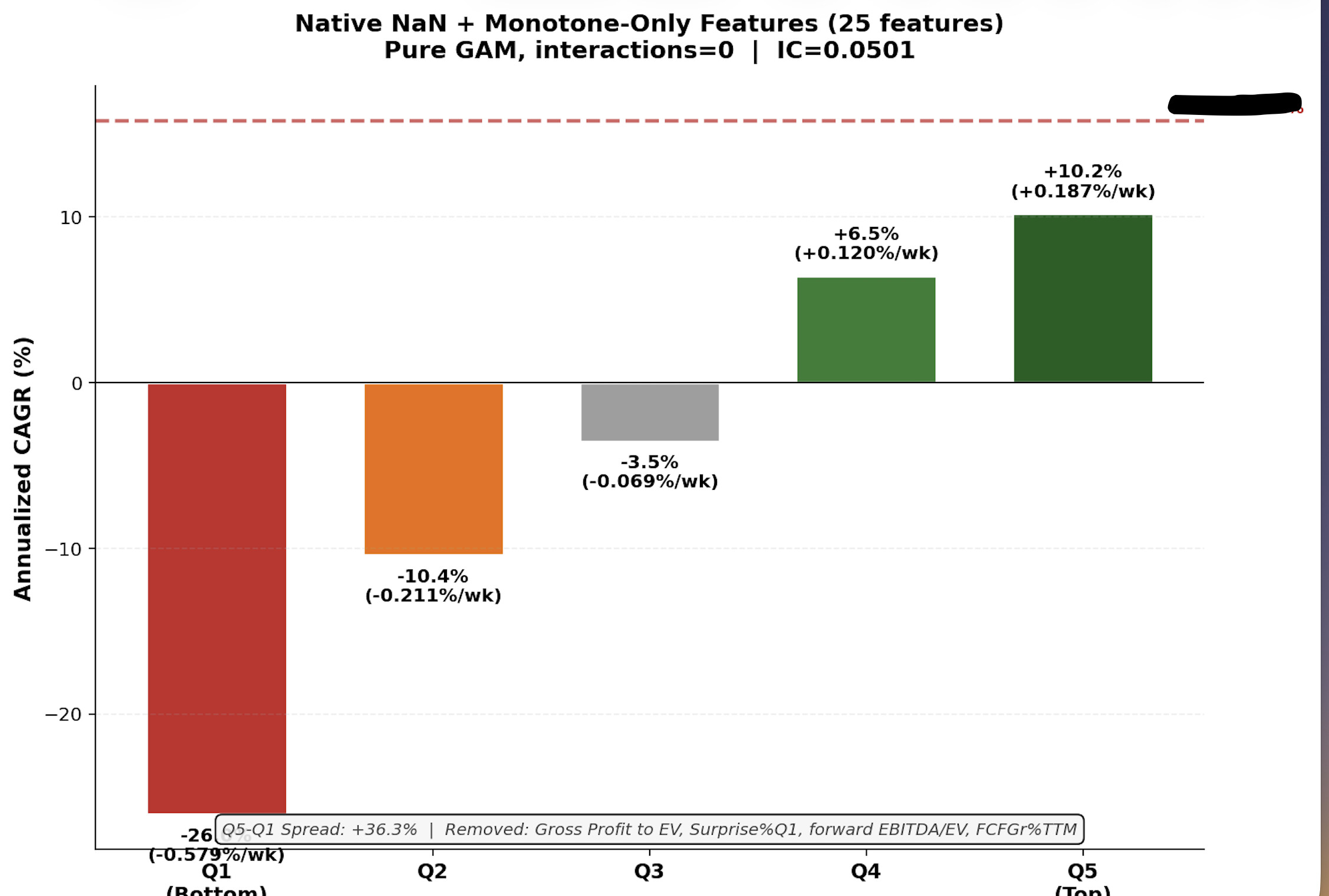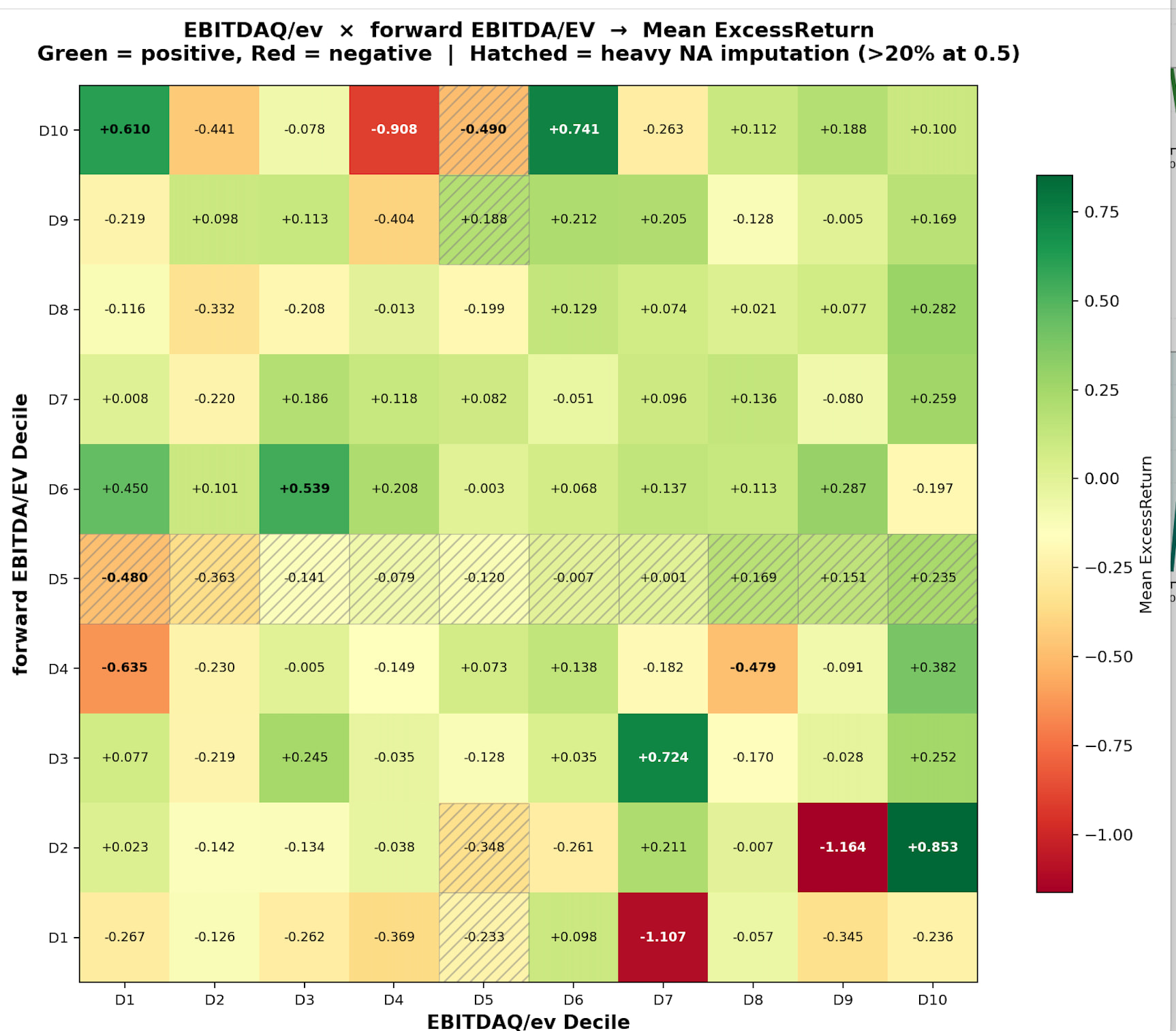 Claude: "One caveat on interactions: with n features and decile bins you have 10^n [1 followed by 29 zeros] possible corners of the feature space. Your investable universe is maybe 4,000 stocks observed weekly. Most corners of the manifold will never be visited by any stock in your dataset — they don't just lack statistical power, they're empty. So any practical model has to focus on the low-dimensional projections where the data is dense enough to learn from. Full interaction modeling is probably unexploitable even in theory for most feature combinations."